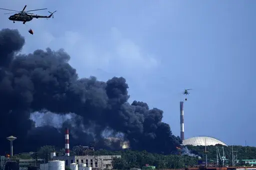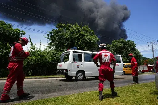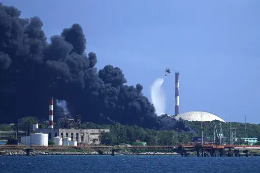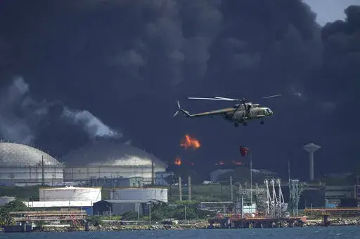 The official Cuban News Agency said lightning hit one tank, starting a fire, and the blaze later spread to a second tank. As military helicopters flew overhead dropping water on the blaze, dense column of black smoke billowed from the facility and spread westward more than 100 kilometers (62 miles) toward Havana.