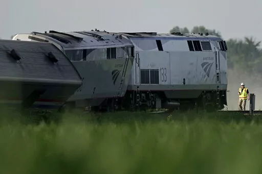 MENDON, Mo. (AP) — An Amtrak passenger train traveling from Los Angeles to Chicago struck a dump truck Monday in a remote area of Missouri, killing three people and injuring dozens more as rail cars tumbled off the tracks and landed on their sides, officials said.