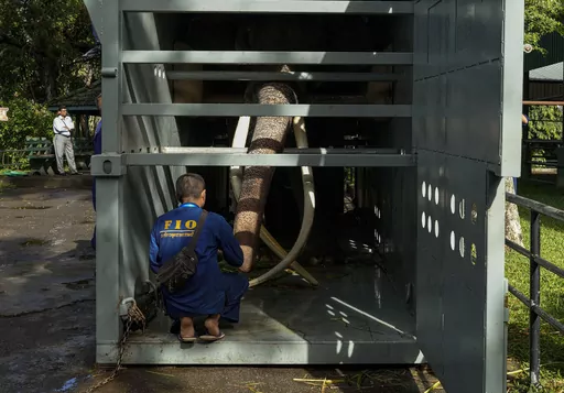 The pachyderm could be heard trumpeting from inside the container that was loaded onto a truck's flatbed trailer to transport him to the government’s Thai Elephant Conservation Center in nearby Lampang province, where he will be quarantined for at least 30 days and stay for rehabilitation.