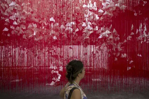 Thousands flooded the exhibition center for VIP previews before doors open to public Thursday. Arriving guests strolled through a large plaza filled with stems of wheat resembling a field, a work by conceptual artist Agnes Denes that was first staged in 1982.
