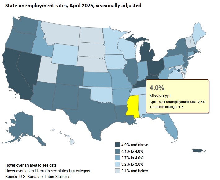 The current unemployment rate for Mississippi (as of April 2025) stands at 4.0 percent.