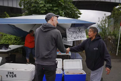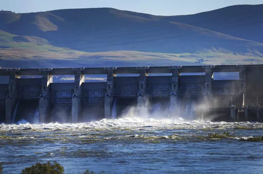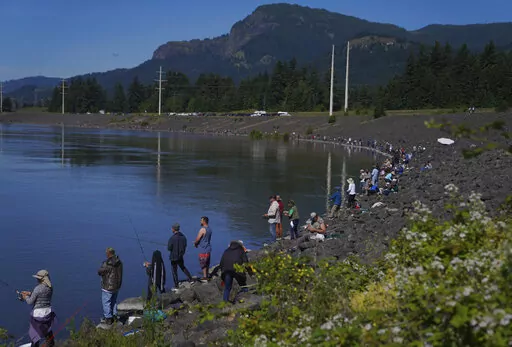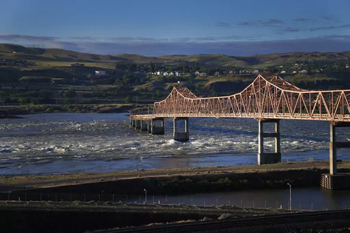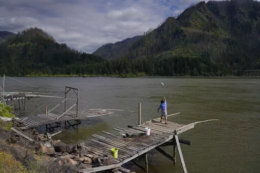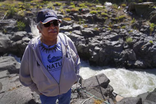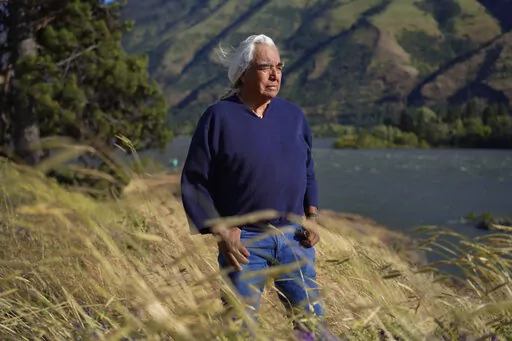 ALONG THE COLUMBIA RIVER (AP) — James Kiona stands on a rocky ledge overlooking Lyle Falls where the water froths and rushes through steep canyon walls just before merging with the Columbia River. His silvery ponytail flutters in the wind, and a string of eagle claws adorns his neck.