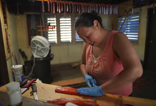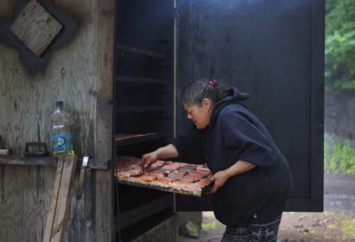 Sandy is smoking freshly caught salmon. She arranges the cleaned and cut-up pieces in trays and places them in a wooden smoking shed by the river. She has a job in a sandwich shop, but this, Sandy says, is “what I do.”
