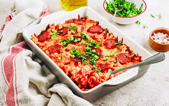Spoon the cheese mixture over the sausage and pasta mixture. Top with pepperoni slices.