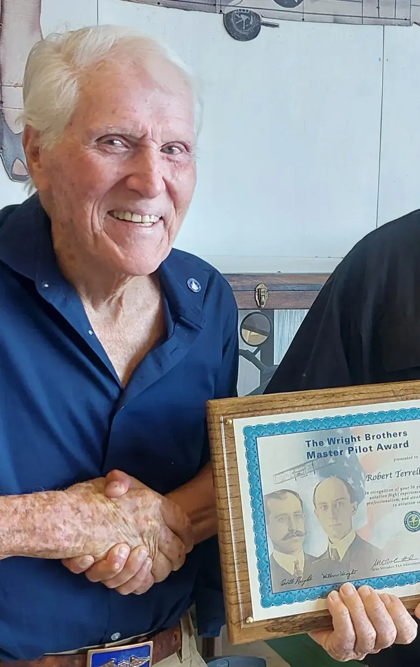 Surrounded by dozens of fellow pilots, FAA officials, family and friends, Bob was handed a plaque that reads, “Fifty Years of Dedicated Service in Aviation Safety. The Department of Transportation Federal Aviation Administration. The Wright Brothers Master Pilot Award presented to Robert Terrell Knight June 11, 2024 in recognition of your 50 years of exemplary aviation flight experience, distinguished professionalism, and steadfast commitment to aviation safety.”