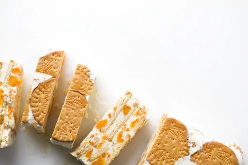 For additional texture, we keep the biscuits mostly whole and layer them in a pan with the fruit-studded cream. After freezing, the dessert is cut into slices that reveal a mosaic-like design. To serve, invert it onto a platter or slice it directly in the pan; if too firm to cut, let it soften for a few minutes at room temperature.