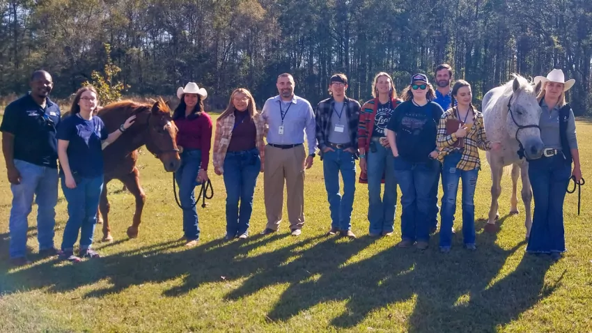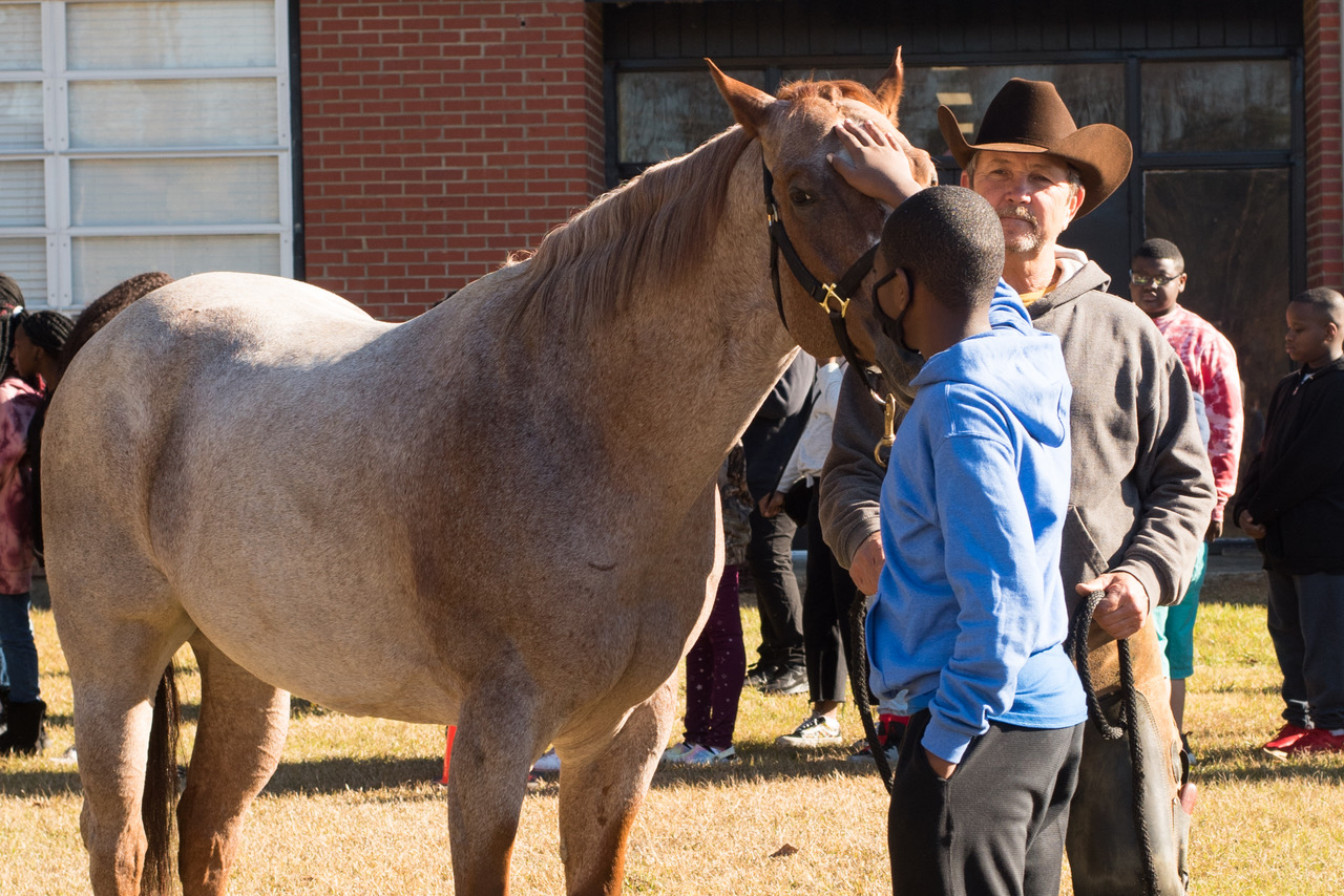 Long Creek Elementary students also enjoyed a Horse Tales presentation on Nov. 28. Sarah Cotton of Attala County Farm Bureau gave an educational presentation to the students and Varner provided the students with information about 4-H. Following the presentation, Greg Bermond of Greg Bermond Performance Horses demonstrated how horses are shod on his 12-year-old gelding, Chase. Each student had the opportunity to hold a horseshoe and pet a horse.