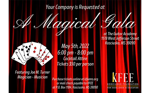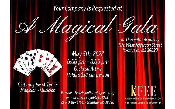 Join us for the KFEE Gala on Thursday, May 5, 6 - 8 p.m. at the Guitar Studio featuring Joe Turner, Musician/Magician. Tickets are $50 per person and may be purchased online at kfeems.org or checks payable to KFEE mailed to PO Box 1184, Kosciusko, MS 39090.