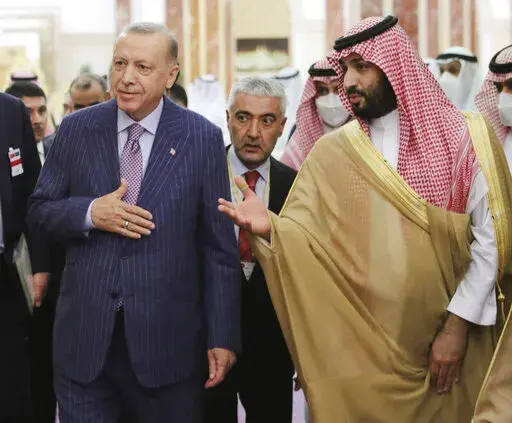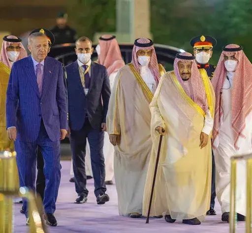 In his first trip to Saudi Arabia in five years, Turkish President Recep Tayyip Erdogan embraced Crown Prince Mohammed bin Salman and sipped traditional Arabic coffee with King Salman before a state dinner and direct talks that ran into the early hours of Friday.