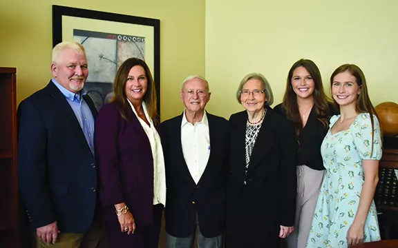 The Turner family (left to right) — husband Tim Turner, Jackie Turner, father Jack Ables, mother Shirley Ables, and daughters Shelby and Lindsey Turner — smiles for a photo at Jackie’s retirement celebration in Jackson.