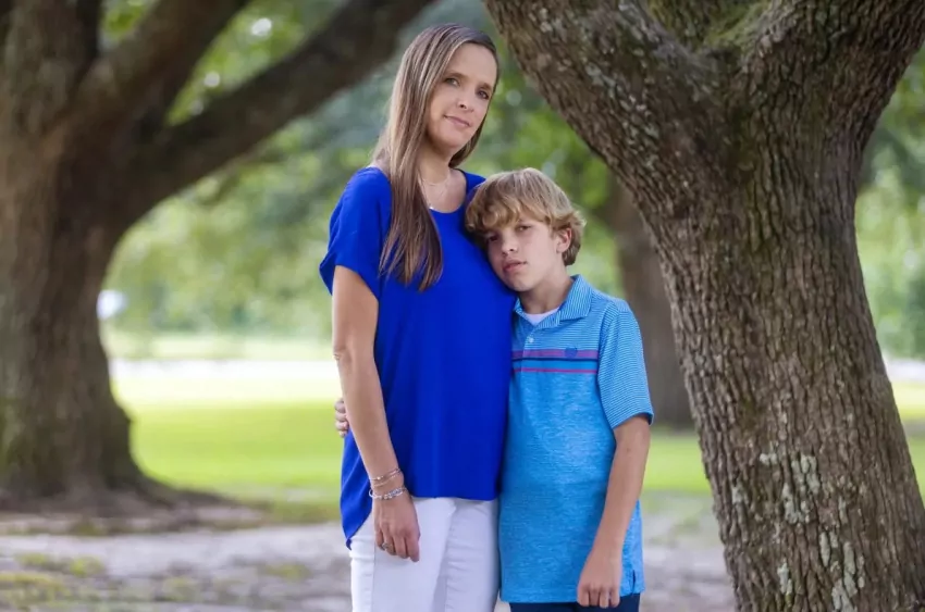 Kristel Robinson and her son Aiden, 11, pose for a portrait outside of their home in Brandon, Miss., Wednesday, September 21, 2022. Aiden was accidentally burned and was treated at the JMS Burn and Reconstruction Center in 2019. The center, which is the only burn center in the state, is set to close in October. Credit: Eric Shelton/Mississippi Today