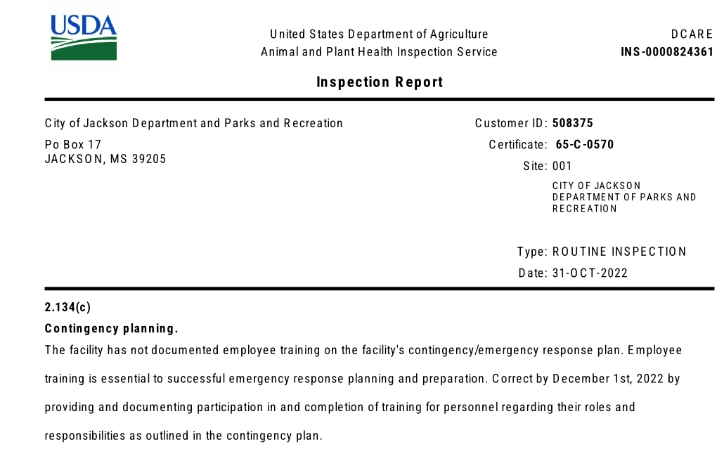 The United States Department of Agriculture, in it's October 22 inspection report noted that only five of ten animal keeper positions are filled.