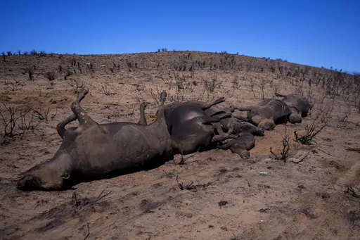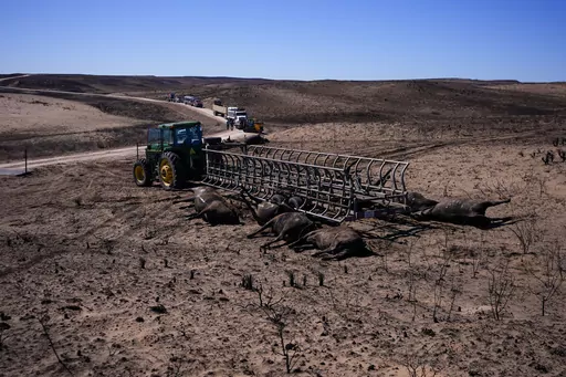 The massive fire has left a charred landscape of scorched prairie, dead cattle and destroyed as many as 500 structures, including burned-out homes, in the Texas Panhandle. It has merged with another fire and crossed the state line into Oklahoma, burning more than 1,700 square miles (4,400 square kilometers) and was 15% contained, the Texas A&M Forest Service said Saturday.