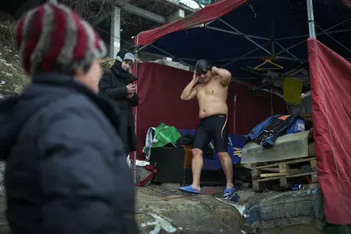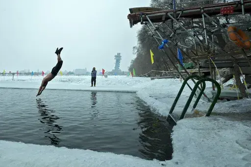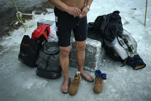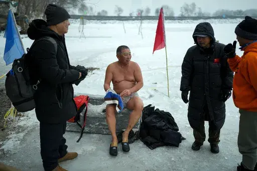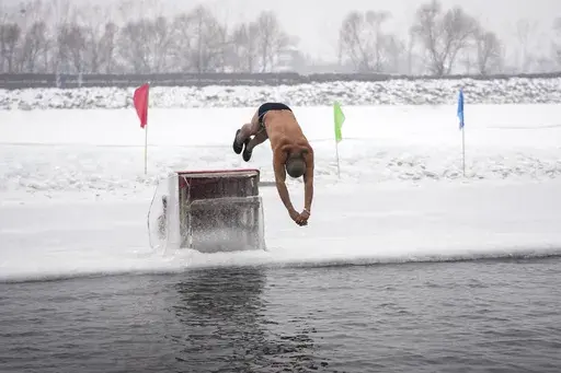 They first carved out a pool in the Songhua River, breaking the 10-centimeter (4-inch) thick layer of ice that had formed again overnight and scooping out the pieces. Then they stripped down and, one by one, plunged into the bone-chilling waters of a pool about 10 meters (30 feet) long.