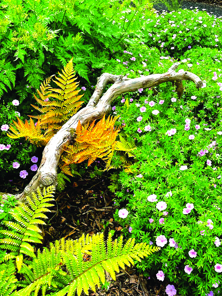 The conversation-starting stumpery in my own garden started in a shaded area as a water feature beside an old stump, and I just kept leaning twisted, gnarly limbs against and around it. Added driftwood and planted ferns, hosta, striped liriope, iris, and others “woodsy” perennials. You can see photos of this and other amazing stumperies by typing the word into the search box at felderrushing.blog.