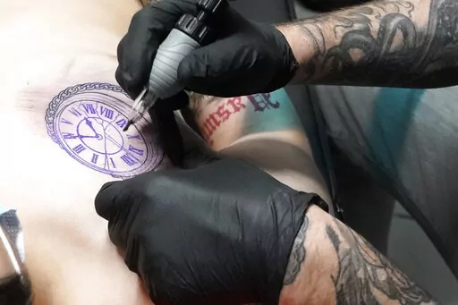 In another tattoo session, Tom Begley traced a new image over a scar on Marinez’s chest from when he was shot last year at a stoplight.