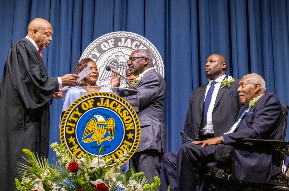 Jackson citizens take an oath of office during the mayor and council inauguration at the Jackson Convention Complex in Jackson, Miss., Tuesday, July 1, 2025. Credit: Eric Shelton/Mississippi Today