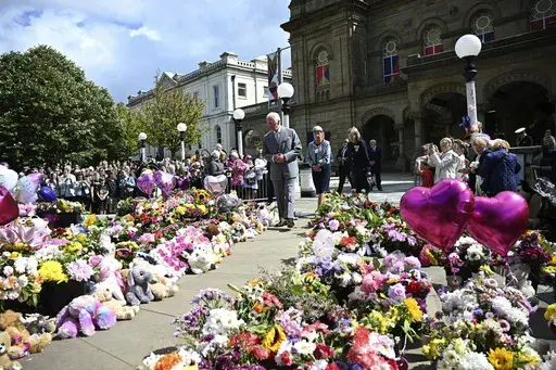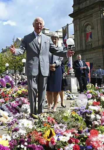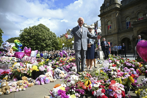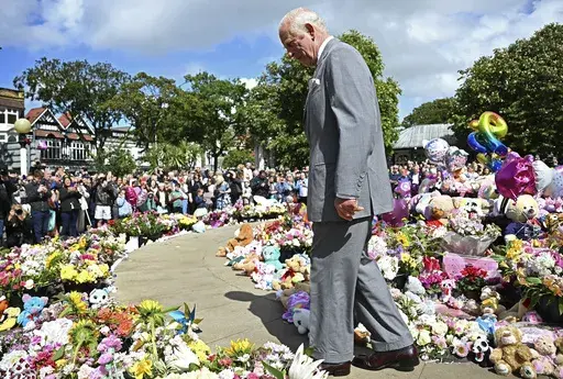 LONDON (AP) — King Charles III met Tuesday with survivors of the stabbing rampage that killed three young girls in northern England, viewing flowers and teddy bears laid in remembrance of the victims and signing a book of condolence as Britain recovers from widespread unrest fueled by misinformation around the tragedy.
