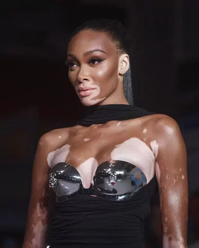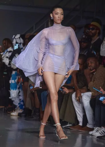 Norwegian model Frida Aasen sported a bralette made of silver wings and a matching silver waist sash over a sheer black figure-hugging skirt.