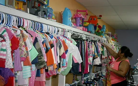 The Smiths with the help of volunteers have converted the thrift shop into spaces of organized shopping. Men’s, women and children’s clothing are located in separate rooms and grouped according to sizes. Other rooms hold glassware, dishes, bric-a-brac and numerous decorative items. Toys are being collected to fill a room. Shelves lining a wall of one room are filled with books of wide and varied subjects. Another room holds shoes, purses and other accessories.