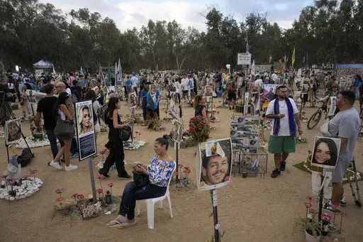 The last sounds of the trance track that was playing at the Nova site on Oct. 7 one year ago stopped abruptly, as hundreds of family members and friends of the more than 300 victims stood in a moment of silence. One woman’s piercing wail broke the silence as booms echoed from the fighting in Gaza, just a few kilometers (miles) away.