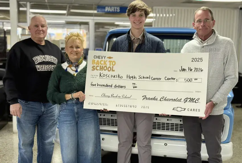 Franks Chevrolet GMC has made a $500 “Chevy Back to School” donation to the Kosciusko High School Career Center while continuing its partnership with the school to provide students with hands-on career exposure and job shadowing opportunities.