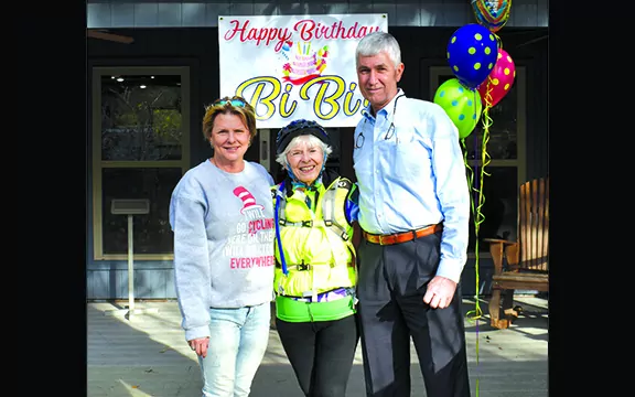 When Katherine Jeter, cycling the Natchez Trace Parkway from Nashville to Natchez, arrived at the Visitor’s Center in Kosciusko Monday afternoon, she was surprised with a birthday party honoring her on her 80th birthday. She was greeted by Mayor Jimmy Cockroft and Donna Holdiness, who coordinates volunteers at the center.