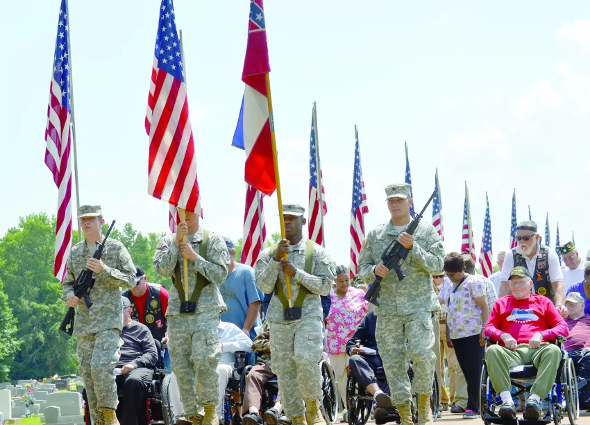 Prior to the address by Proctor, a group of veterans marched with the Mississippi Army National Guard Honor Guard from the cemetery to the pavilion on the cemetery grounds.
