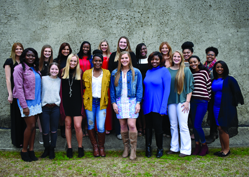 Charity Ball pages, front row from left, Addie Burrell, Callie Welch and Macey Steed; back row from left, Lacy Fail Greenlee, Lauren Nowell, Kathryn Clair Shuler, Hayley Haffey,and Lillian Dean.