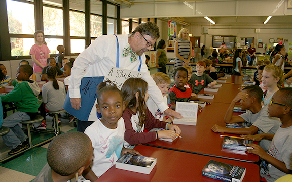 Last week Rotarian Dr. Larry Routt, dressed as Mr. Dictionary, gave instructions in use of the dictionary as copies of “A Student’s Dictionary and Gazetteer” were handed out. Rotarian Rev. Philip Palmertree assisted in the distribution. At Middle Elementary in Kosciusko, 249 students received their copies; 48 at Long Creek Elementary; 68 at Greenlee Elementary; 18 at Presbyterian Day School. Teachers, the school libraries and the Oprah Winfrey Boys and Girls Club also received copies.
