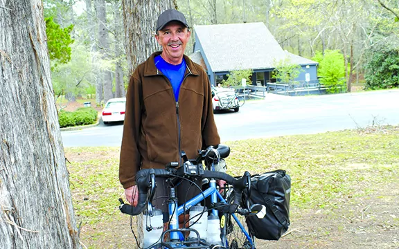 Becker took a break at the Visitors Center in Kosciusko recently, having started his bicycle trek in Natchez.