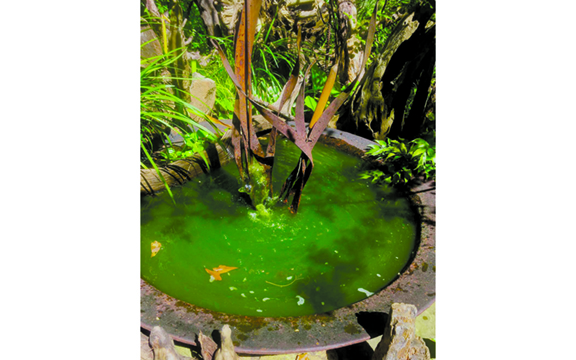 I recently set up another water feature beside a backyard deck where I spend a lot of time staring into a fire, even on warm evenings. It was easy, just a smaller iron cooking kettle with a water pump and fountain to make splashy sounds closer to where I sit. Because it is in the shade, there is no algae, and the moving water from the fountain prevents mosquito larvae.