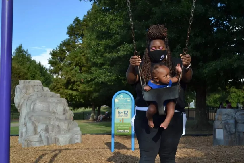 Darlene Smith strolls through Freedom Ridge park in Ridgeland with her 9-month-old baby Martez on Saturday, September 19, 2021. Credit: Anna Wolfe/Mississippi Today