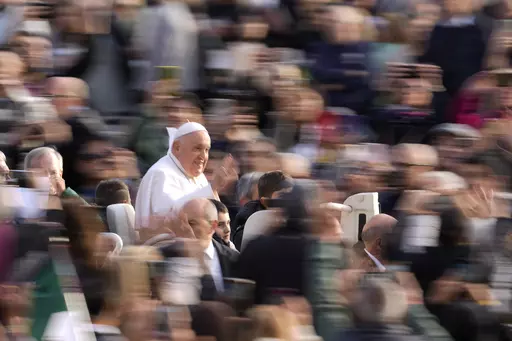 Francis spoke about the meetings at the end of his weekly general audience in St. Peter's Square, where some people in the VIP seats wearing Palestinian scarves held up small posters showing bodies in a ditch and the word “Genocide” written underneath.