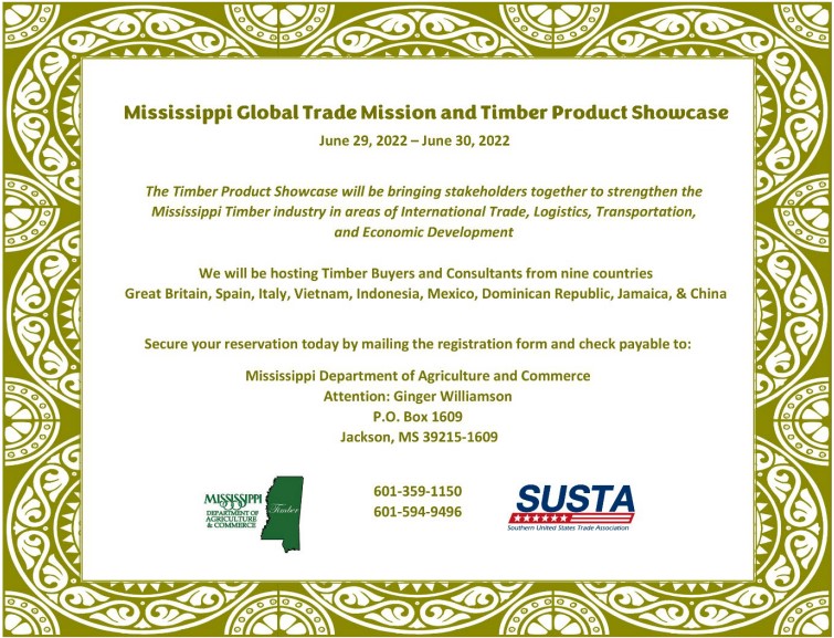 “I am proud of this opportunity for Mississippi timber exporters and the entire timber industry to visit with delegations from nine important world markets,” said Commissioner of Agriculture and Commerce Andy Gipson, who also serves as President of SUSTA. “This Showcase will bring stakeholders together to help strengthen Mississippi’s timber industry in areas of international trade, logistics, transportation and economic development. I encourage those interested in growing their export markets and trade network to participate in the first-ever Mississippi Timber Product Showcase.”