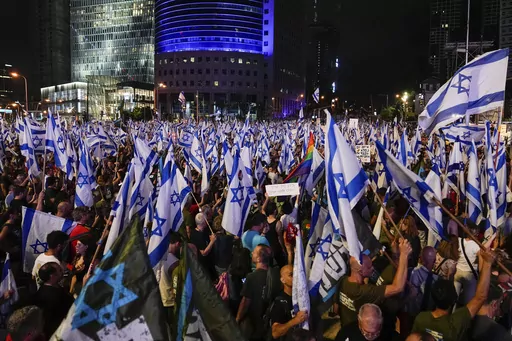 TEL AVIV, Israel (AP) — Israel's anti-government protest movement gained new momentum on Saturday night as tens of thousands of people spilled into the streets of cities across the country to oppose Prime Minister Benjamin Netanyahu's contentious plan to overhaul the judicial system.