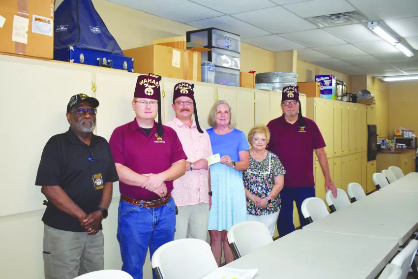 At the donation presentation are, from left, Mervin Foster Sr., Veterans Service Office; Dwaine Steed, member of the Central Mississippi Shrine Club; Jon St. Clare, president of the Central Mississippi Shrine Club; Greyce Powell, chair of the United Veterans of Attala County; Janie Wallace, administrative assistant at the Veterans Service Office; and David White, member of the Central Mississippi Shrine Club.