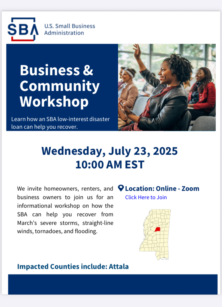 The virtual event, conducted via Zoom, targets residents and businesses in Attala County and other impacted areas across Mississippi. Participants can join the workshop by clicking a registration link provided by the SBA.