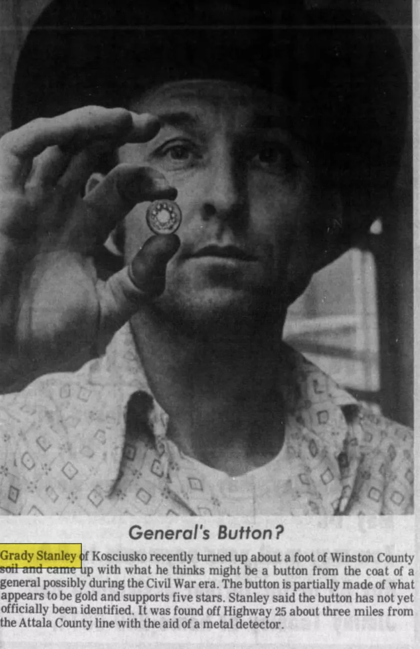 Grady was once in The Star-Herald after he found a button that appeared to be from a coat of a general possibly during the Civil War era. He found it using his metal detector off Highway 23 in Winston County, about three miles from the Attala County line. He also had an extensive collection of Attala County artifacts, and he once had an archaeological display at the Attala County Library. His collection included seashells, arrowheads, coins, military buttons, belt buckles, china, cooking and eating utensils. He had a selection of coins and military buttons dating back to the War of 1812.