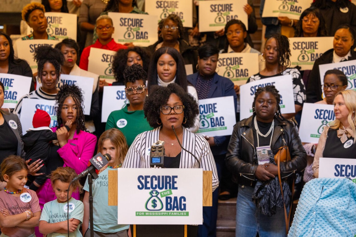 “Inside those money bags are coins that represent access to child care, access to health care, higher wages for families and the need to move paid family and medical leave,” said Robin Jackson, director of policy advocacy for the Mississippi Black Women’s Roundtable. “We are not asking you anymore – we are telling you ‘Secure the bag for Mississippi families.’”