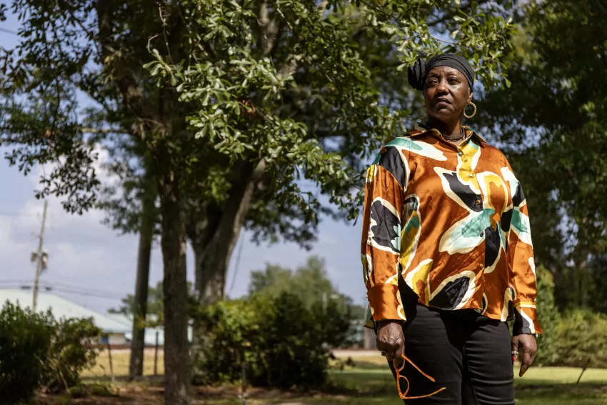 Candace Abdul-Tawwab, left, listens as Okolo Rashid gives her thoughts on the Israeli–Palestinian conflict during a pro-Palestine rally at the International Museum of Muslim Culture in Jackson, Miss., on Monday, Oct. 16, 2023. Credit: Eric J. Shelton/Mississippi Today