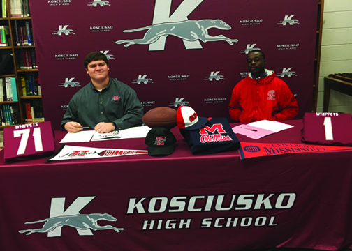 Two Kosciusko seniors signed scholarships last Wednesday, the first day of the February signing period, to continue playing football at the next level.