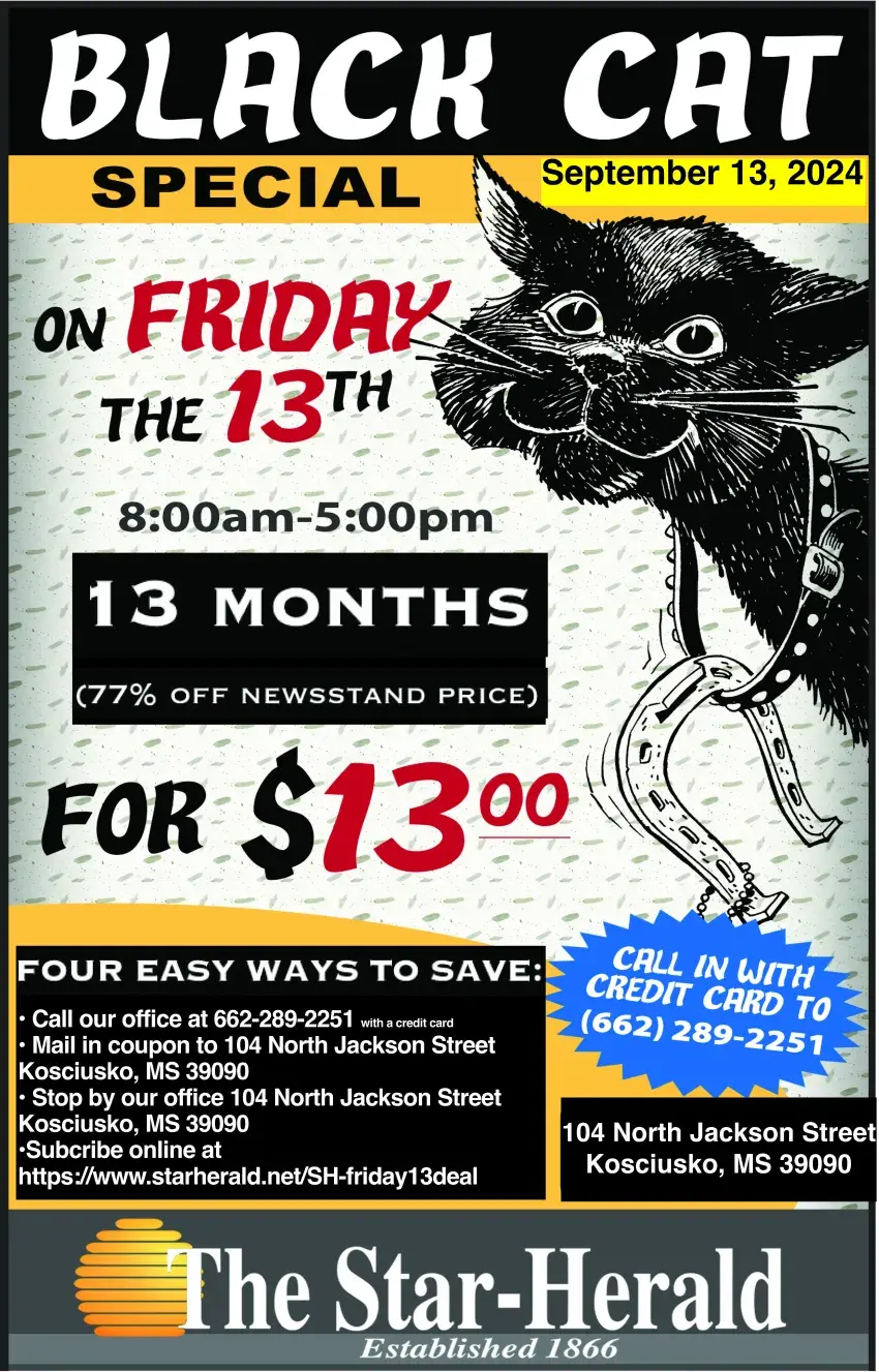 To seize this special offer, interested parties can sign up at https://www.starherald.net/SH-friday13sale or visit the newspaper office at 104 North Jackson Street between 8 a.m. and 5 p.m. on Sept. 13. Alternatively, payments via credit card or debit card can be made by calling 662-289-2251.