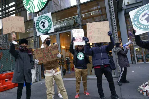 Others, including Michelle Eisen, a union organizer at one of the first stores to organize in Buffalo, New York, said workers are angry that Starbucks promised higher pay and benefits to non-union stores. Starbucks says it is following the law and can't give union stores pay hikes without bargaining.