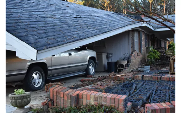 Outbuildings on the property were crushed under the weight of old trees felled by the storm, and the front wall of the carport collapsed, causing its roof to crash down to be held up by their SUV.