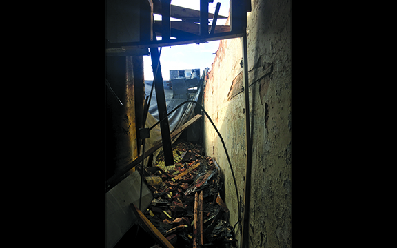 of an exterior wall collapsed and a portion of the roof on the old Leonard’s building caved in.