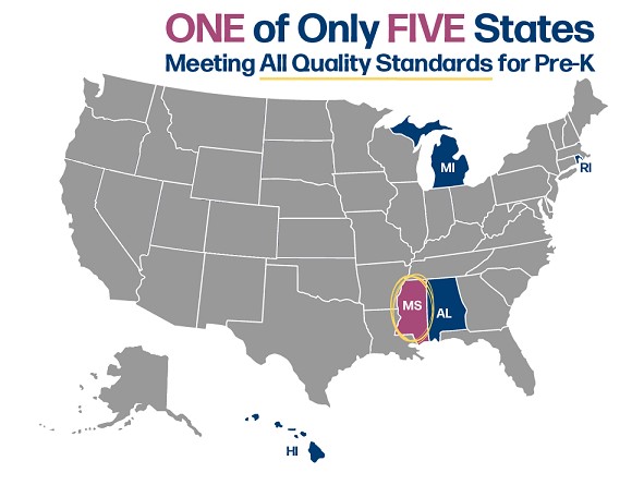 The National Institute for Early Education Research (NIEER) recognized Mississippi in its latest report on pre-K quality as one of only five states whose state-funded pre-K program meets all 10 quality standards for early childhood education.