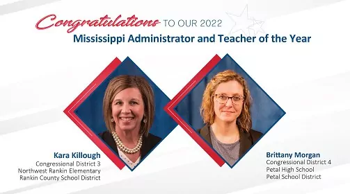 The Mississippi Department of Education (MDE) today announced the 2022 Mississippi Administrator of the Year (MAOY) is Kara Killough, principal of Northwest Rankin Elementary School in the Rankin County School District, and the 2022 Mississippi Teacher of the Year (MTOY) is Brittany Morgan of Petal High School in the Petal School District.