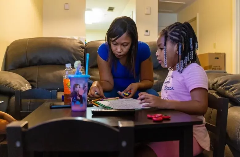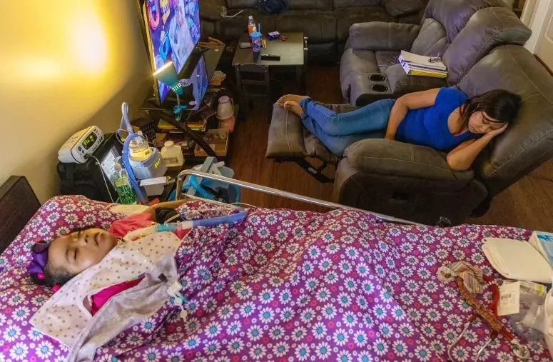 Shavondra Smalley wakes up on her living room couch and looks at her 8-year-old daughter Layla stretched out on a hospital bed beside her, BiPAP machine humming. The two start their day as they always do.