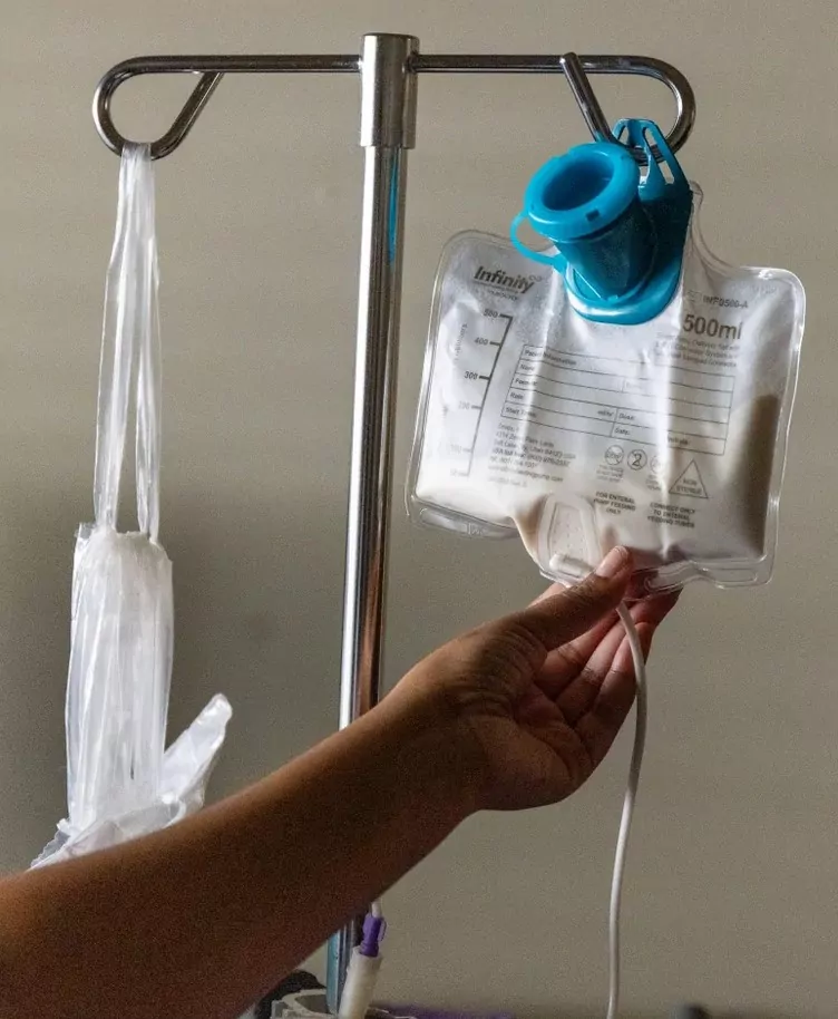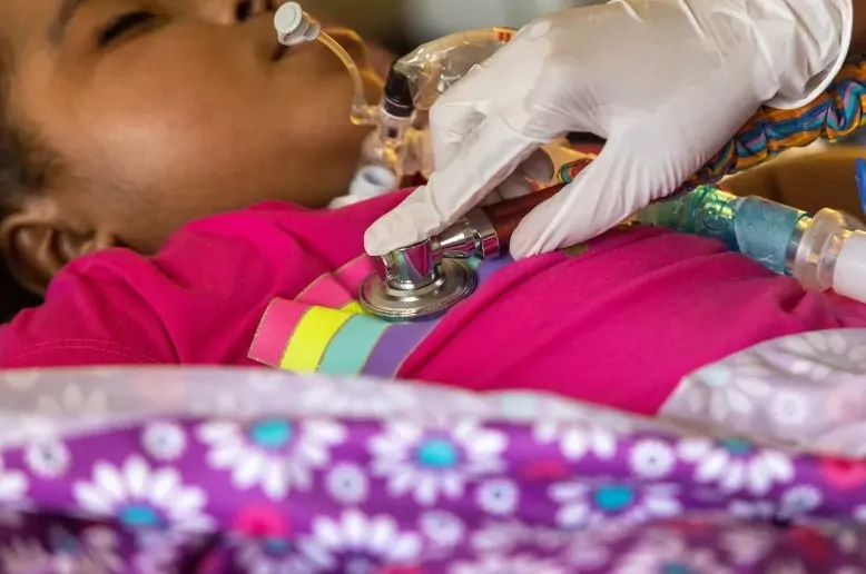 Smalley pulls out a stethoscope and listens to Layla’s labored breathing, checking to see how much mucus has built up in her trachea in the four hours since she last performed this sacred task. She grabs a chest percussion therapy cup, shaped like the bottom of a toilet plunger, and taps her daughter’s chest with it for around five minutes. Having broken up any secretions that could obstruct Layla’s airflow, she then inserts a suction catheter into her tracheostomy tube and removes the debris.